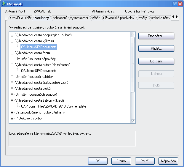 Nastavenie aktuálneho užívateľského prostredia je definované v súbore default.arg záložke Profily dialógu Možnosti /Kapitola 2, časť - Štandardné prostredie a štandardný výkres./.