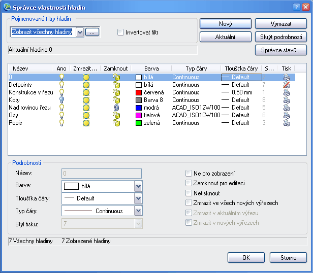 Štandardne nový výkres obsahuje len jednu hladinu 0. Štruktúru výkresu s hladinami si navrhujeme a vytvárame sami. Pre