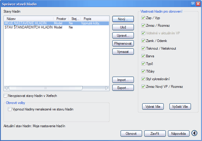Nastavenie stavov vlastností hladín rozsiahlejších výkresov si môžeme uložiť
